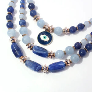 Design: Triple-layered beaded necklace with deep blue and soft sky-blue beads, highlighted by a striking evil-eye charm