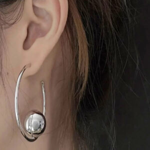 Design: These unique, semi-open hoops feature a sleek, golden arc with a prominent, polished orb suspended at its center. The design creates a modern, sculptural look that appears to defy gravity.