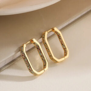 Design: Elongated, rectangular hoops adorned with a vibrant array of multi-colored, pave-set stones