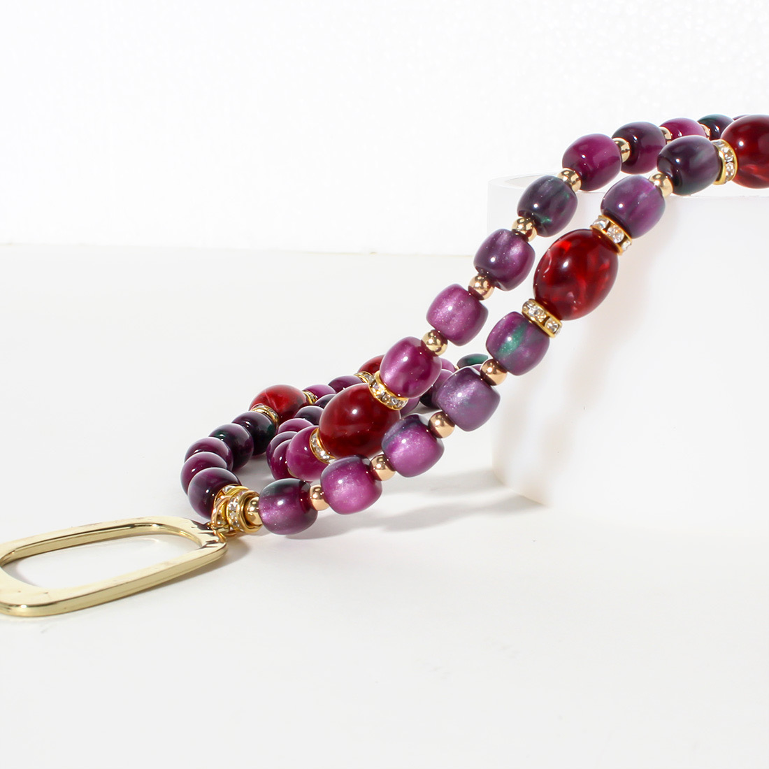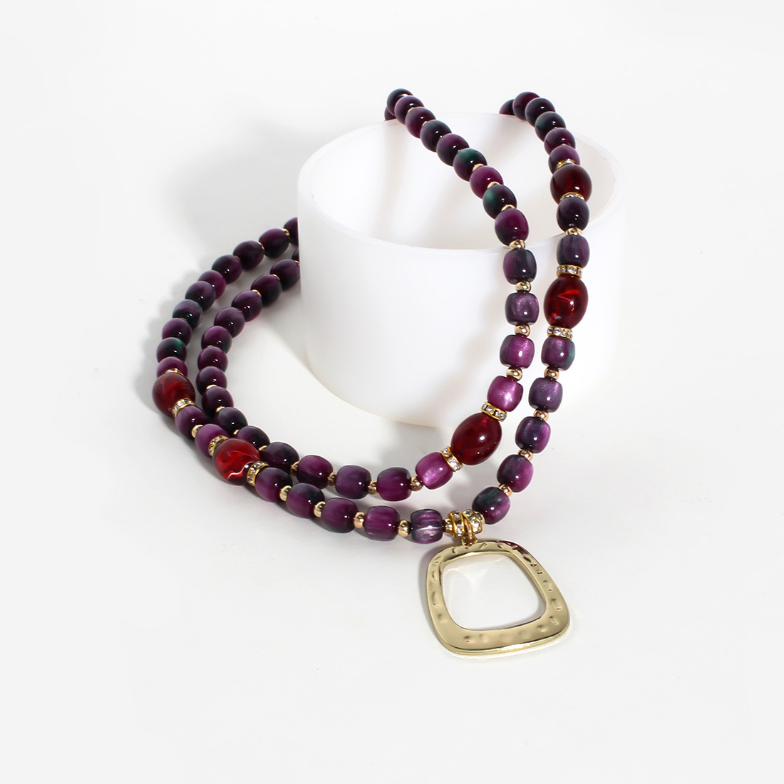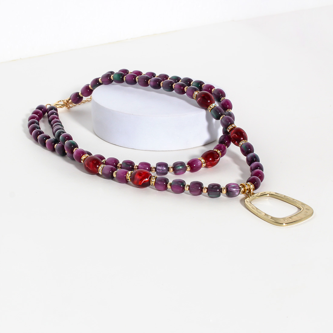 Design: Double-layered necklace with vibrant purple and red beads, accented by a bold gold geometric pendant