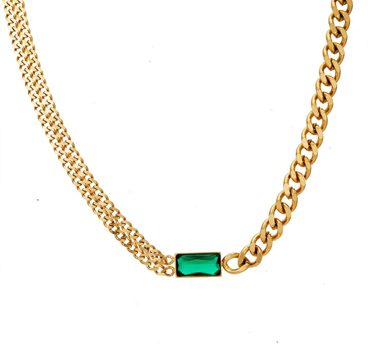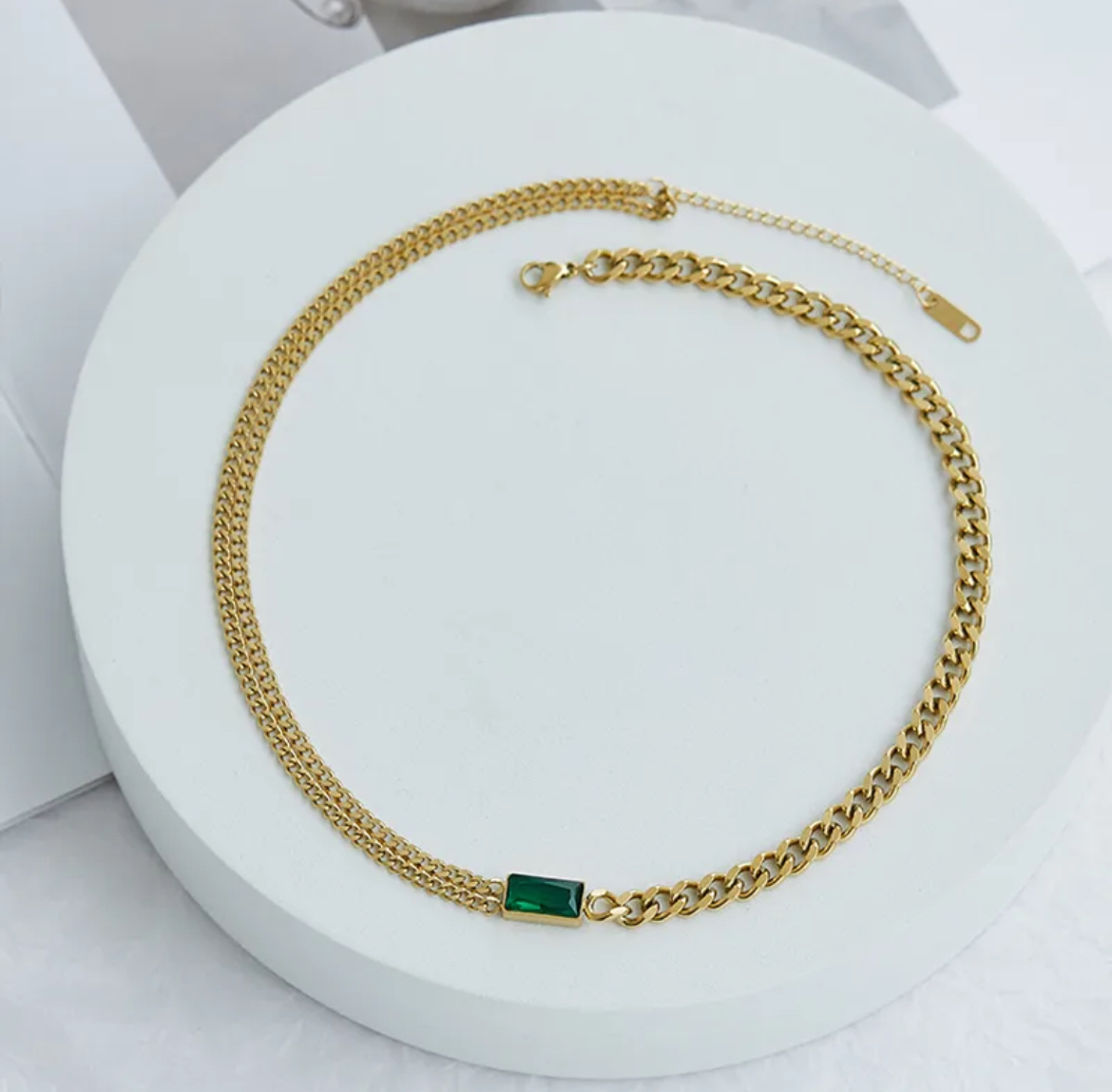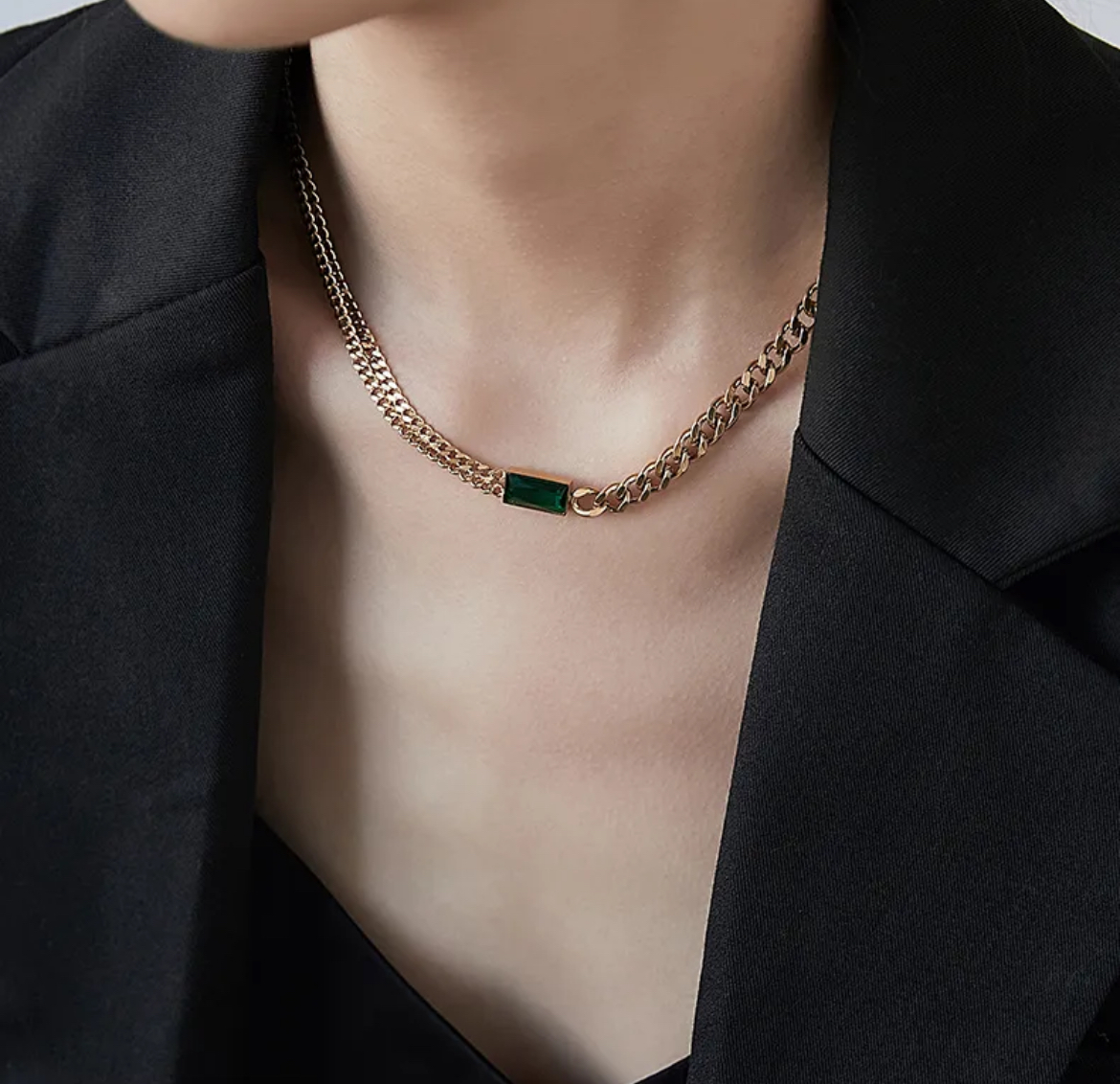 Design: Sleek gold chain with a modern rectangular emerald-green stone accent at the center