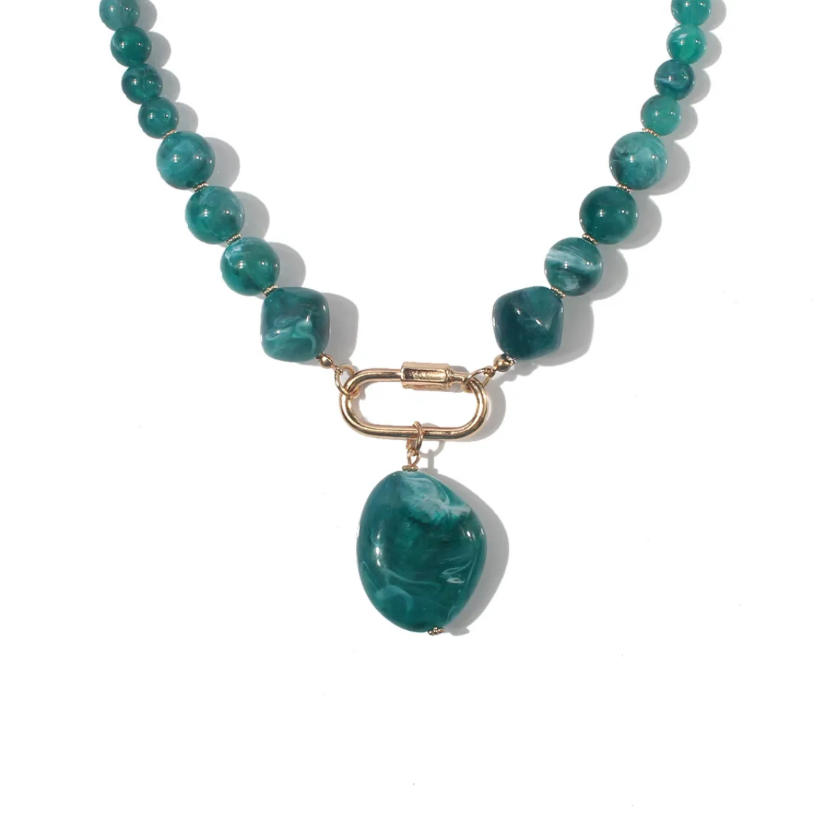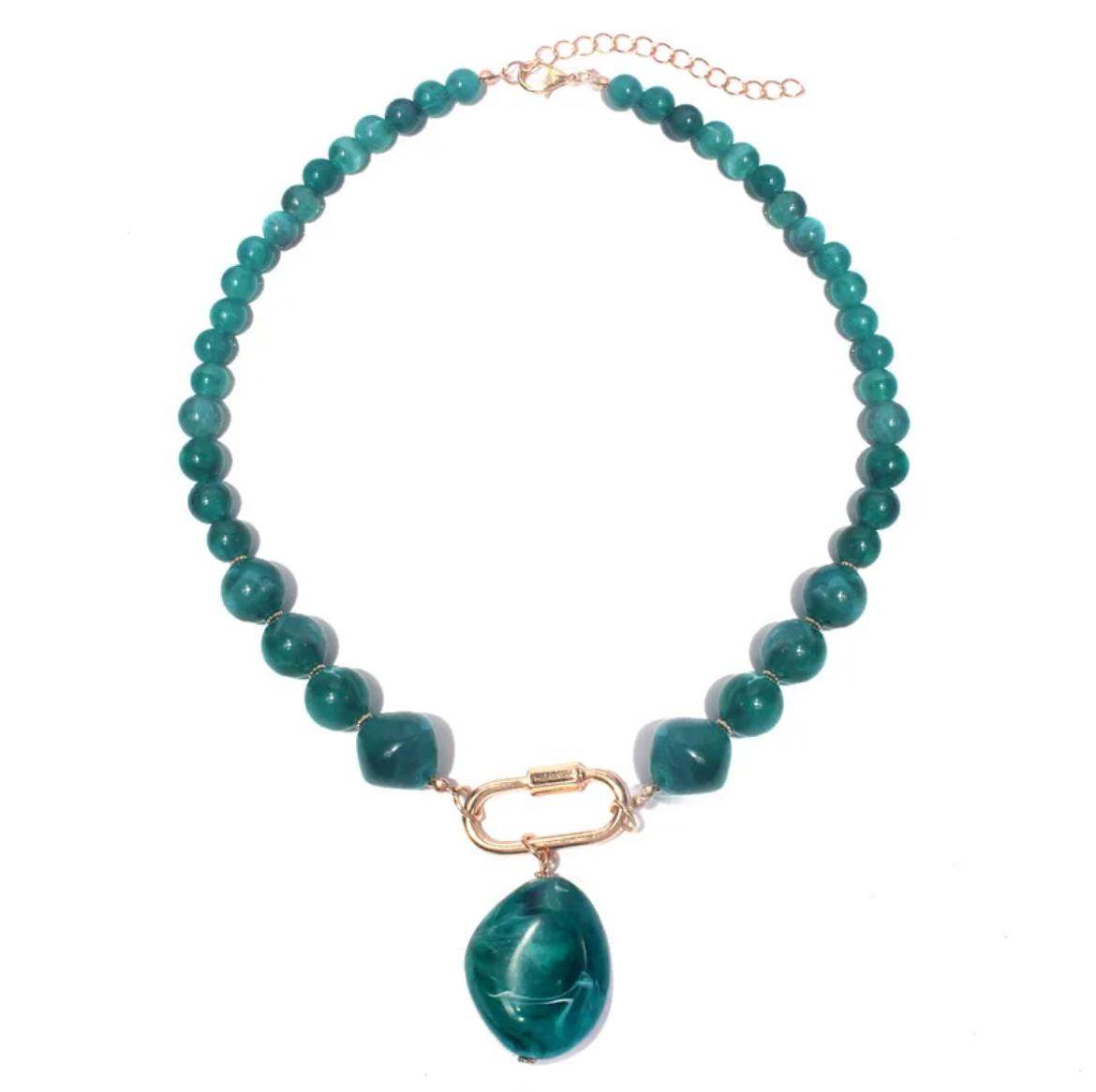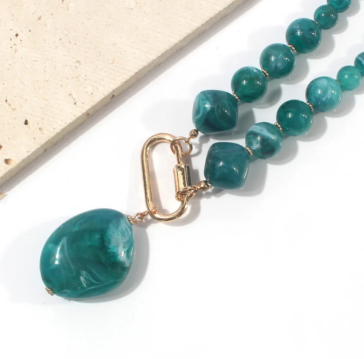 Design: Elegant strand of polished teal beads with a bold teardrop pendant, accented by a modern gold-tone connector