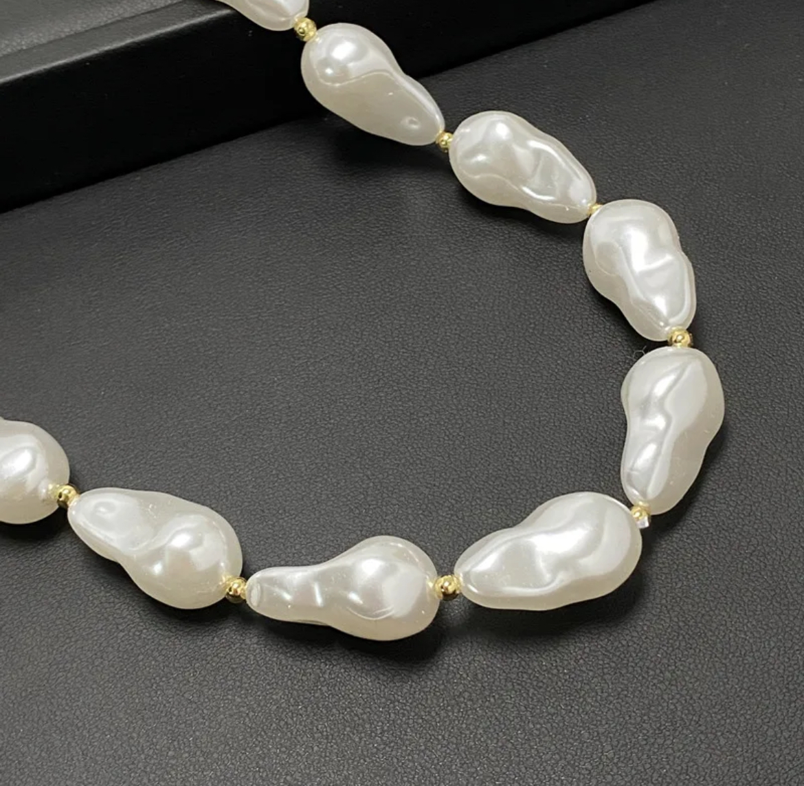Design: Striking necklace featuring bold baroque-style pearls with golden bead accents