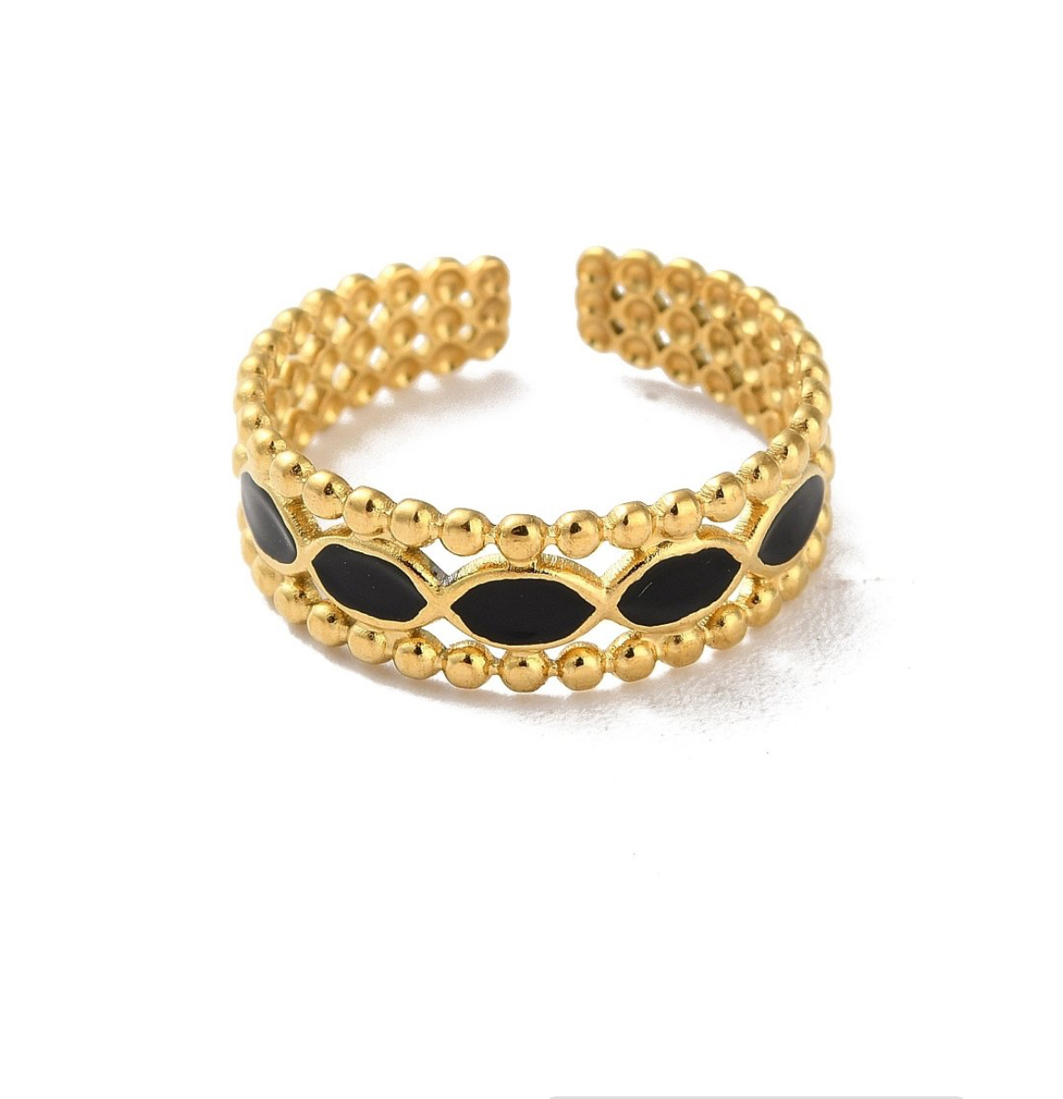 Design: Textured gold ring with a central strand of alternating gold beads and dark, marquise-shaped stones