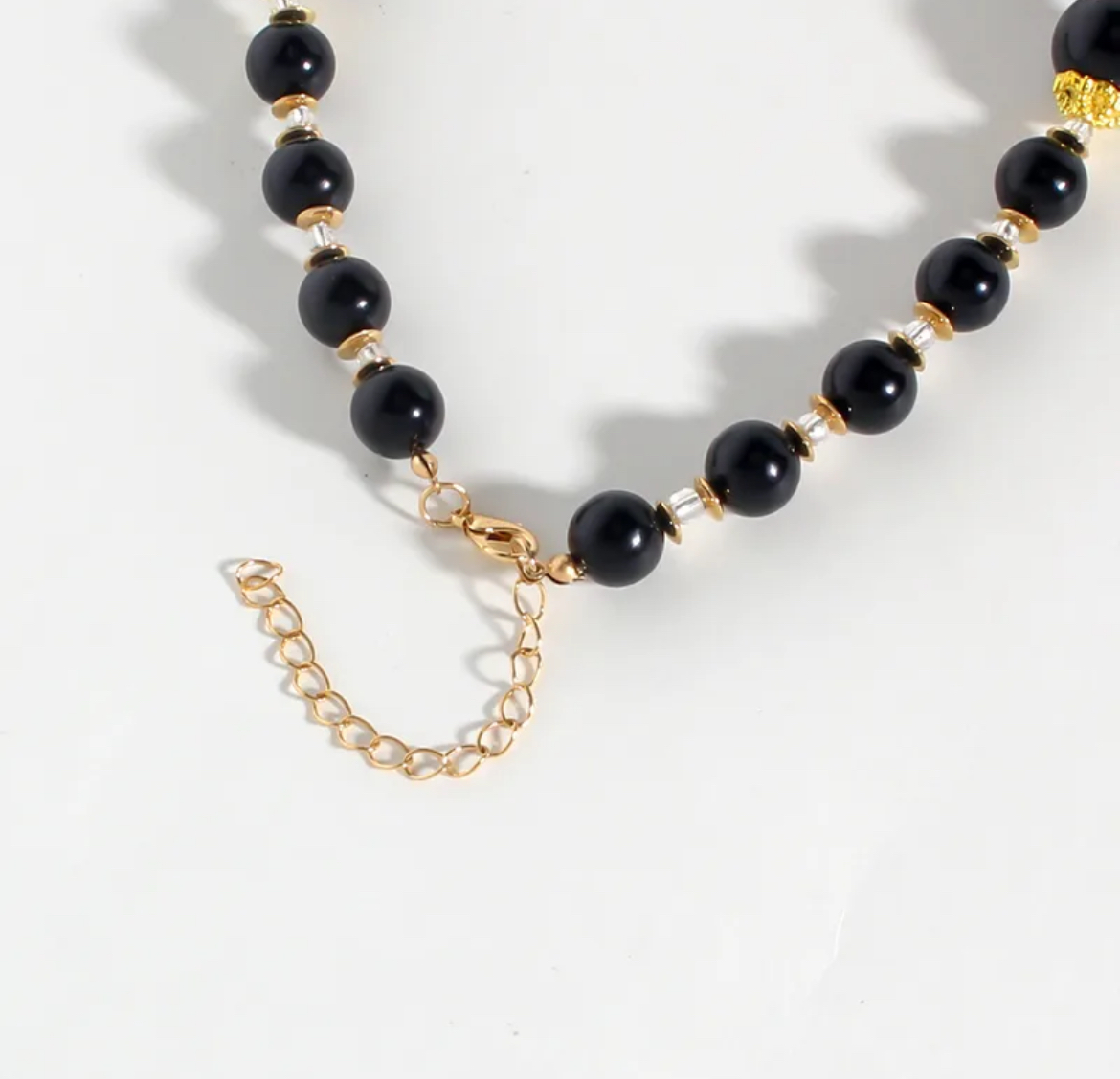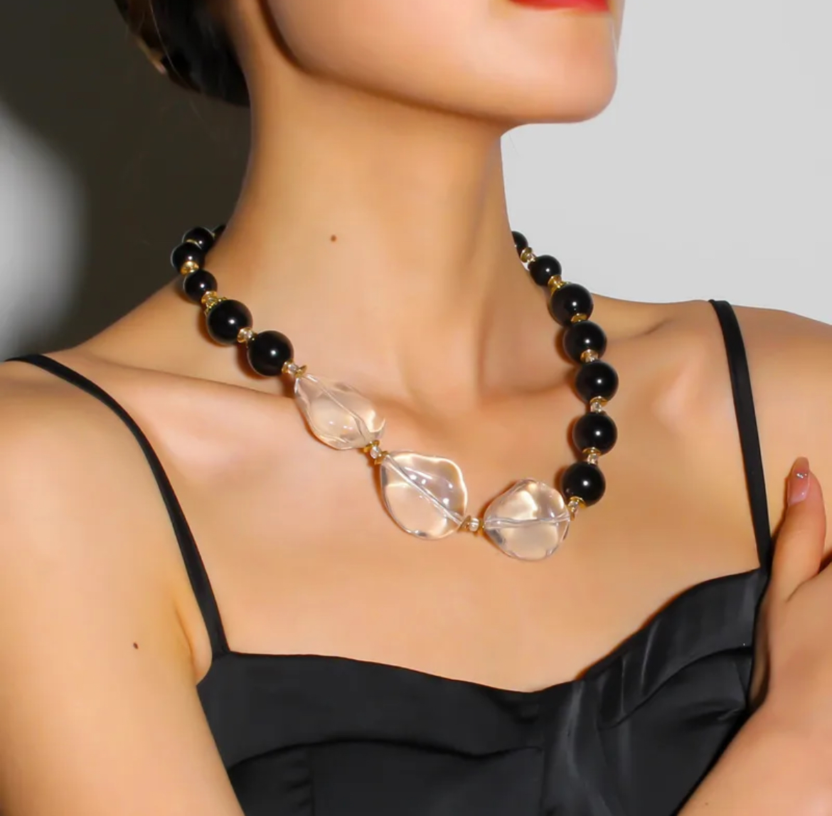 Design: A striking mix of glossy black beads and sculpted crystal-clear resin pieces
