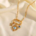 This piece features a modern link chain that holds a unique, oval-shaped carabiner clasp. Hanging from this focal point are three mystical charms: a sparkling starburst accented with a central crystal, a dainty blue and white evil eye, and a larger, ornate evil eye pendant adorned with a crescent moon and star. This necklace is an expressive accessory designed to bring both symbolic meaning and contemporary flair to your jewelry collection.