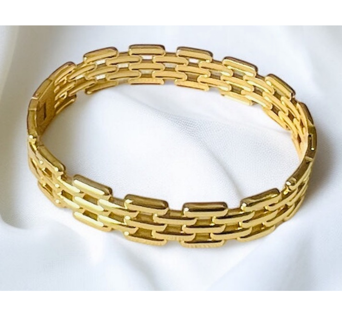 Design: Timeless three-row link pattern with a smooth, polished finish that reflects light beautifully