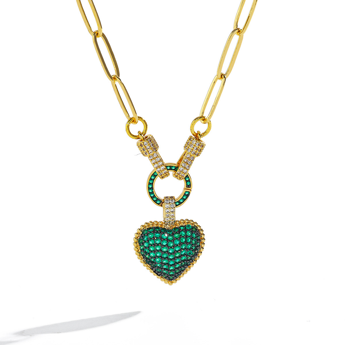 • Design: Pavé-set green heart pendant with crystal-accented paperclip chain