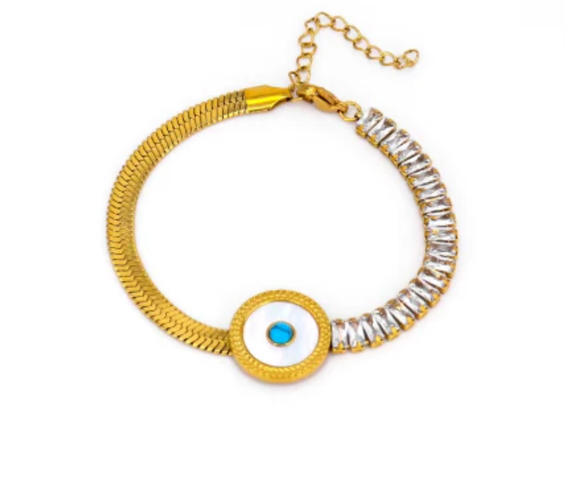 Design: Modern half-and-half bracelet with a striking evil eye centerpiece