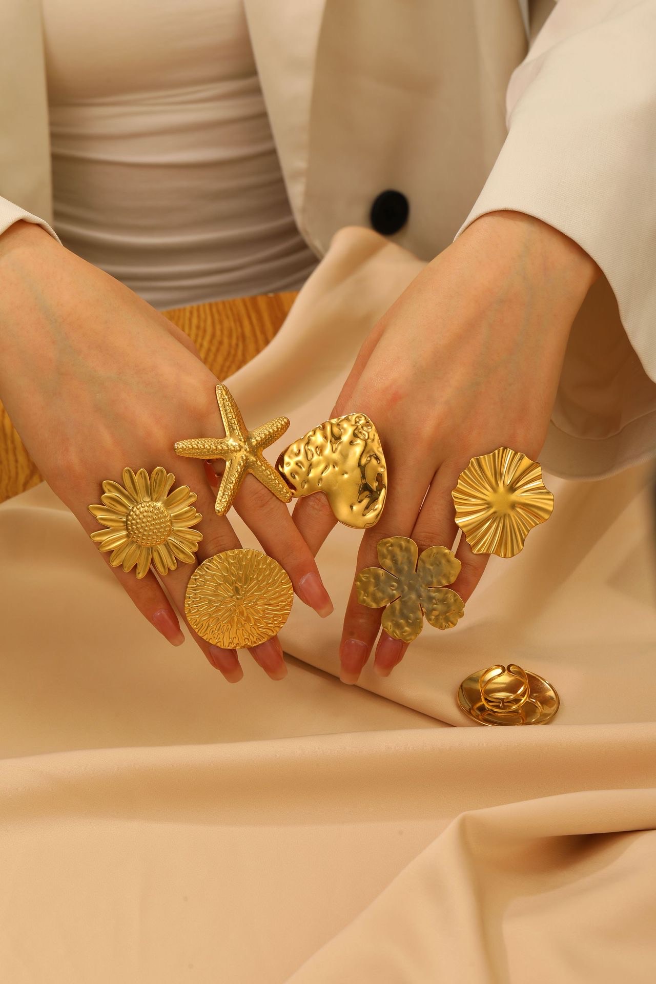 This stunning sunflower-inspired statement ring is meticulously crafted with a high-polish gold-toned finish, this ring features two layers of delicately sculpted petals surrounding a textured center that mimics natural sunflower seeds. The bold, oversized bloom sits comfortably on an adjustable band, making it a vibrant focal point that brings a touch of eternal summer to any look.