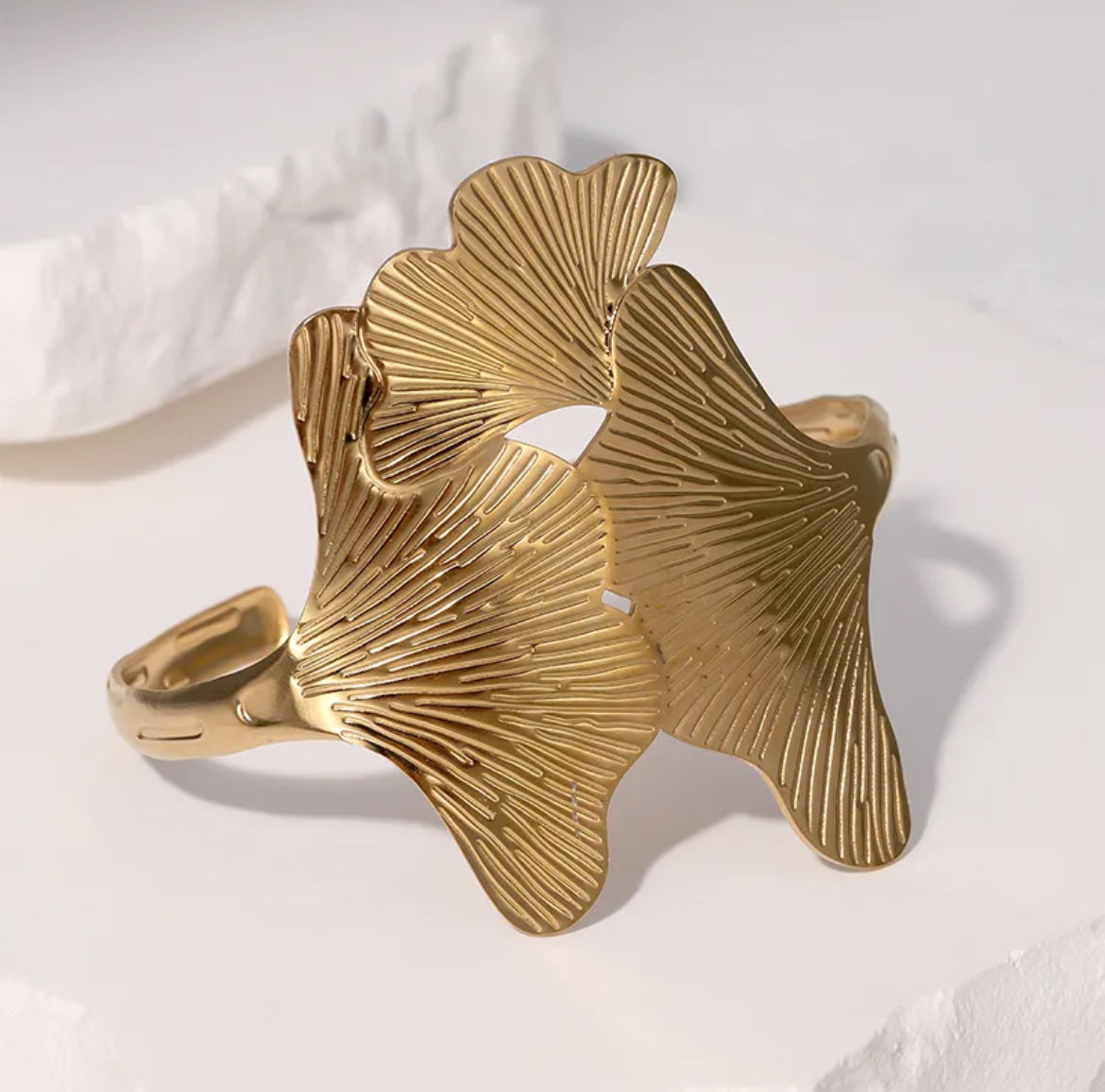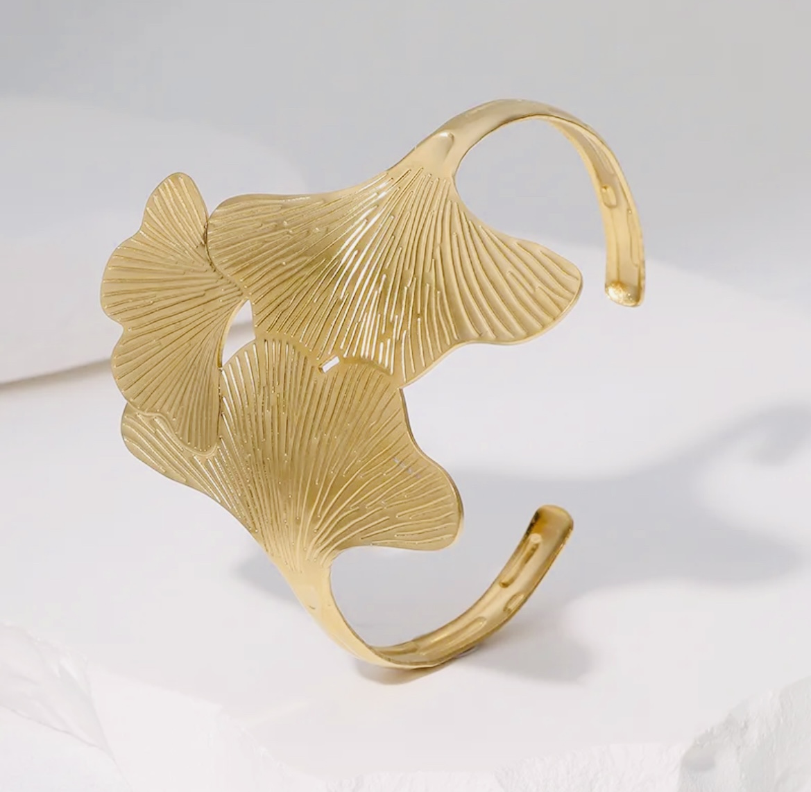 Design: Artistic open cuff inspired by ginkgo leaves with finely etched vein details
