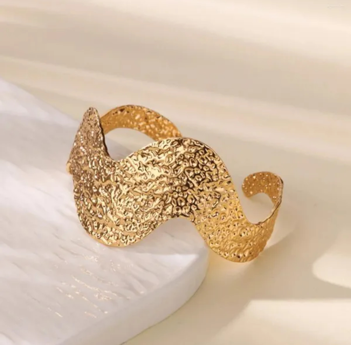 Design: Bold open cuff with feather-inspired carved detailing for a textured, sculptural look