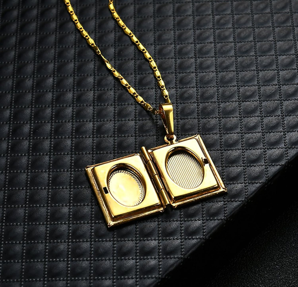 Design: Intricately engraved book-shaped locket with vintage detailing
