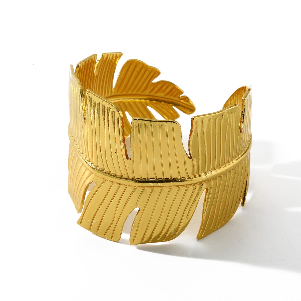 Design: Bold open cuff with feather-inspired carved detailing for a textured, sculptural look