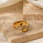 Design: A bold, open-ended ring with a unique fluid, sculptural design. It features two polished, droplet-like forms that gracefully wrap around the finger.