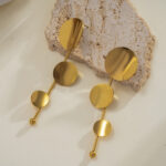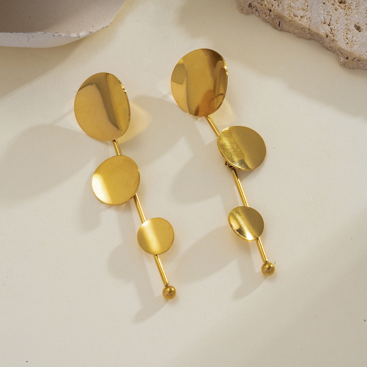 These striking drop earrings feature a tiered arrangement of polished golden discs. Inspired by the various phases of a solar eclipse, the design consists of a large circular stud that suspends a slender golden rod adorned with two smaller, perfectly weighted discs. These earrings offer a sleek, minimalist aesthetic, making them a standout accessory for the modern trendsetter.