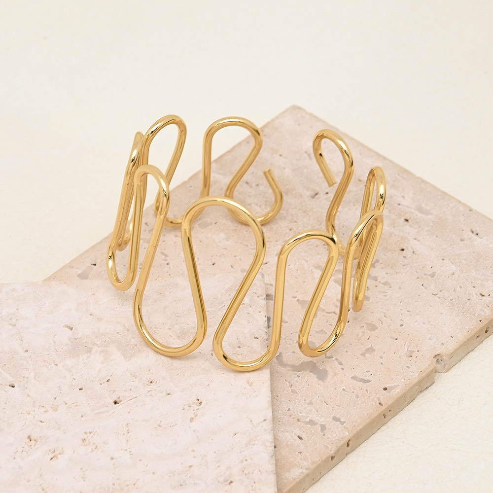 Crafted with fluid lines and an artistic silhouette, this minimalist cuff draws inspiration from natural curves and modern design. Its open, wave-like structure creates a lightweight statement that feels effortless yet refined—perfect for everyday elegance or subtle layering.