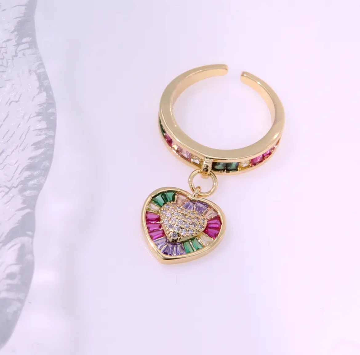 Design: An open-cuff ring with a dangling heart charm, featuring a colorful array of baguette and round-cut stones