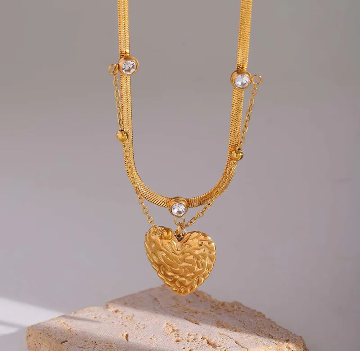 Design: A statement layered necklace featuring a textured gold heart pendant, accented with sparkling crystal charms for added brilliance.