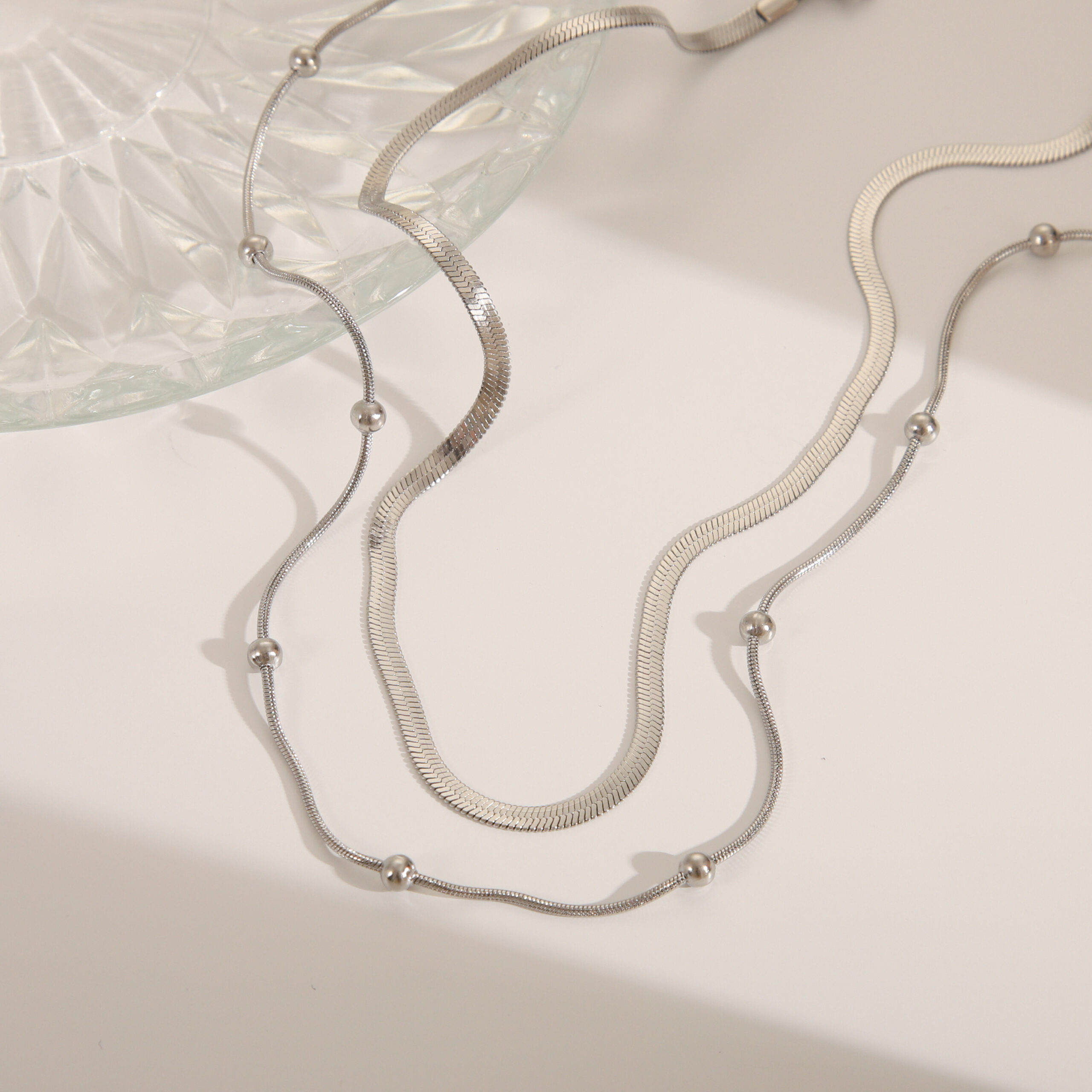 • Design: A two-piece set featuring one wide herringbone (snake) chain and one slim beaded station chain adorned with small, polished spheres.