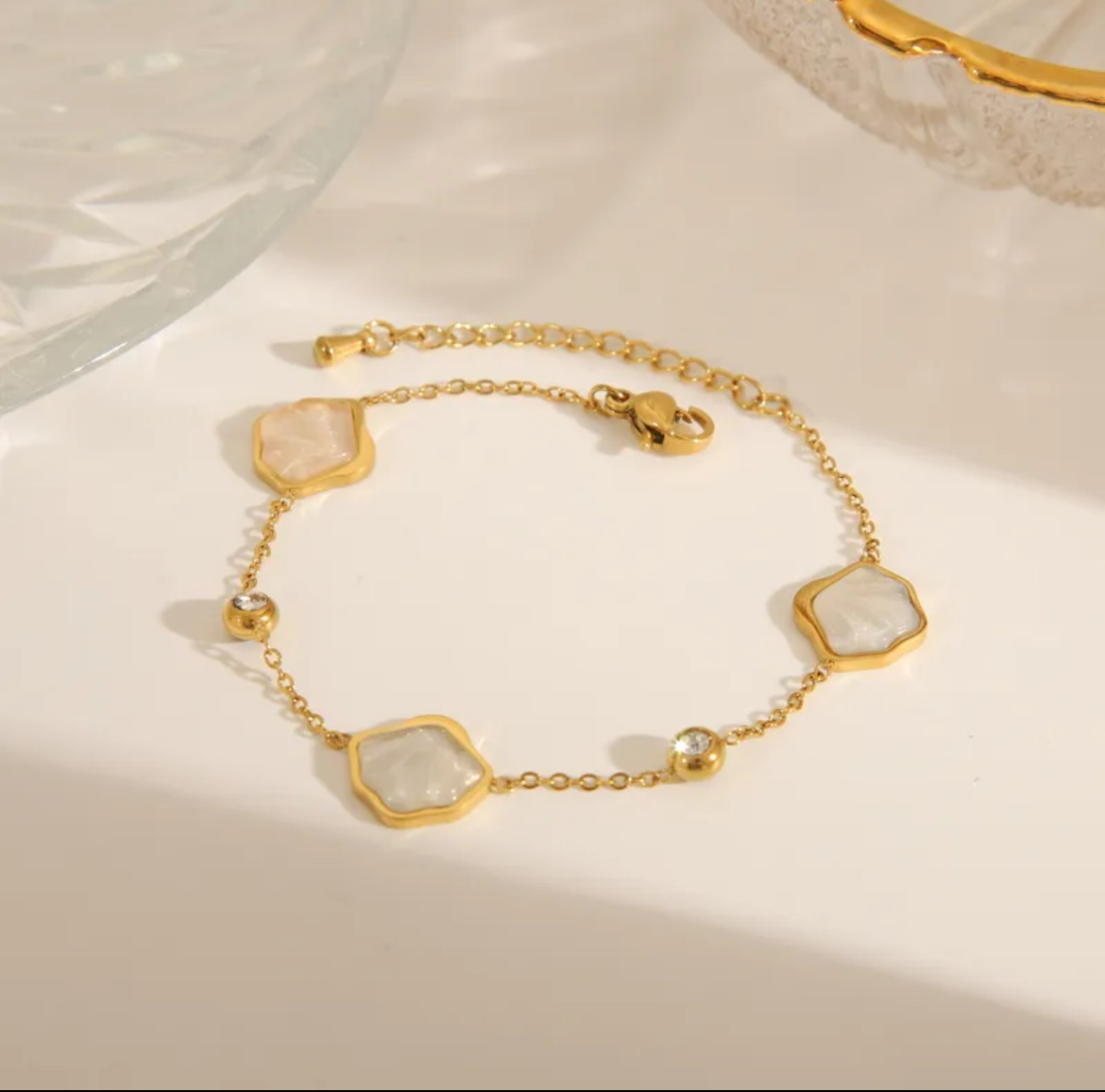 Design: Delicate chain bracelet adorned with geometric mother-of-pearl charms and sparkling crystal accents