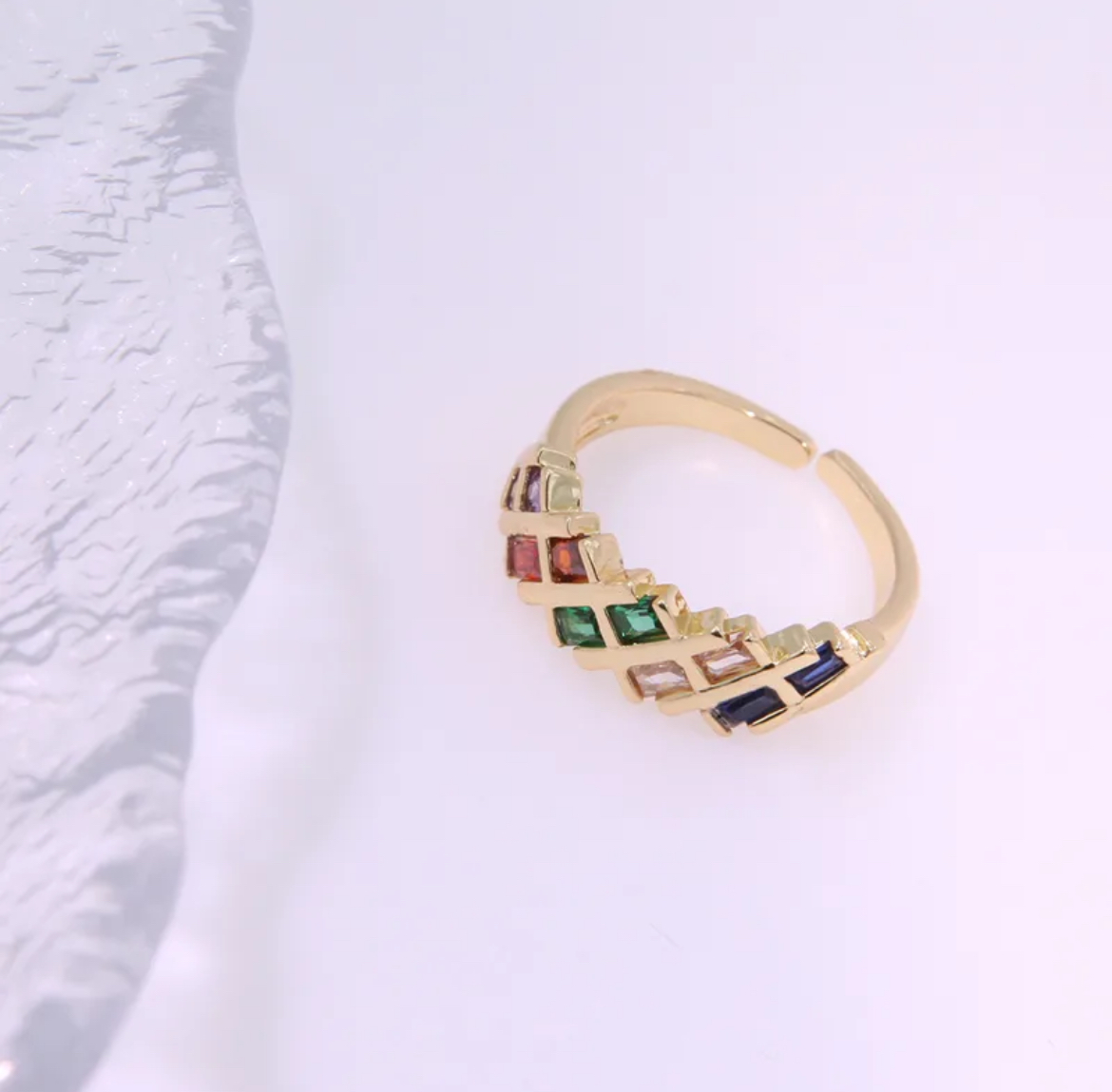 Design: A statement ring adorned with a mosaic of multi-colored, square-cut stones