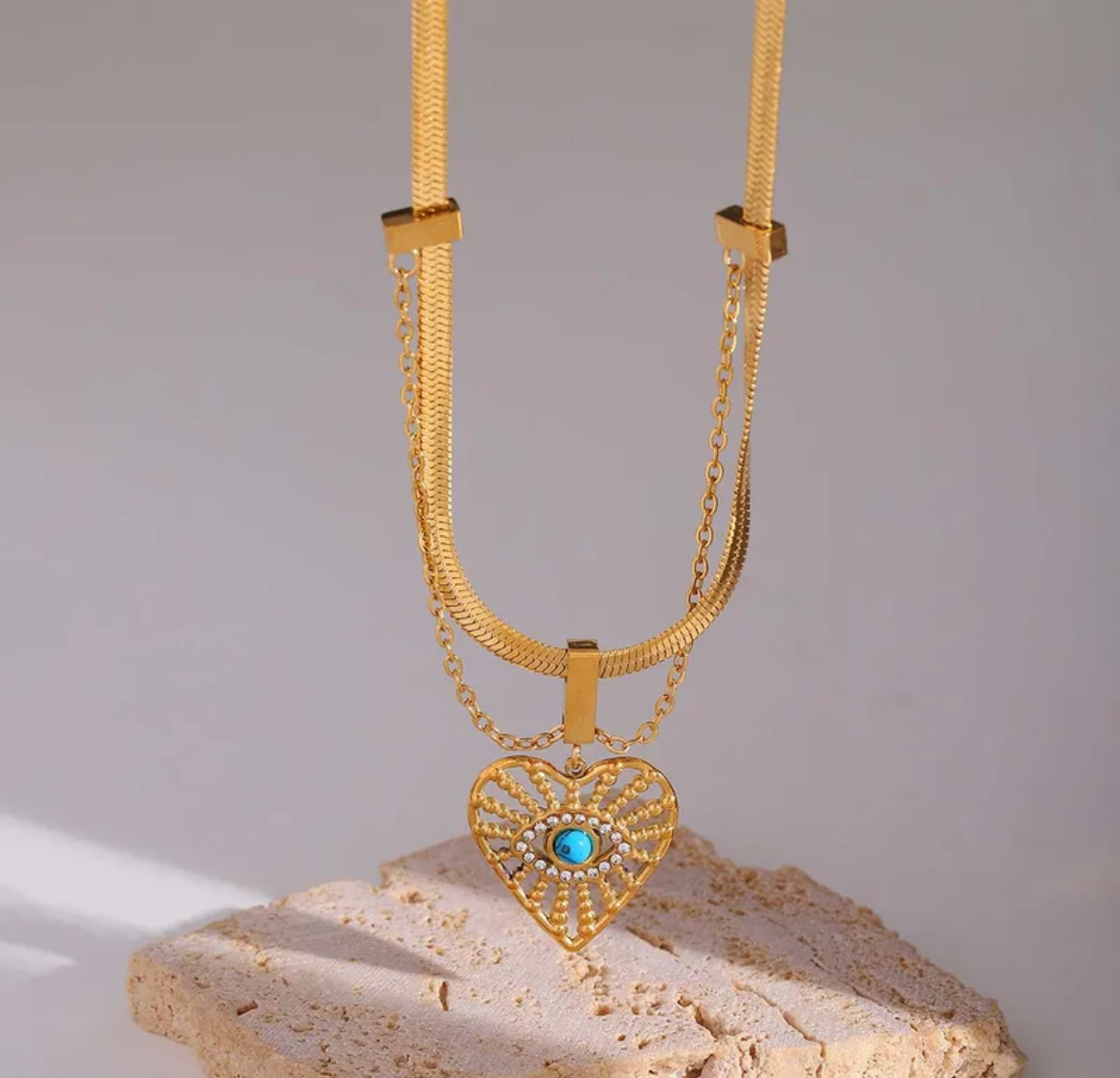 Design: A radiant gold-plated layered necklace featuring a heart-shaped pendant with an enchanting blue evil eye at its center.