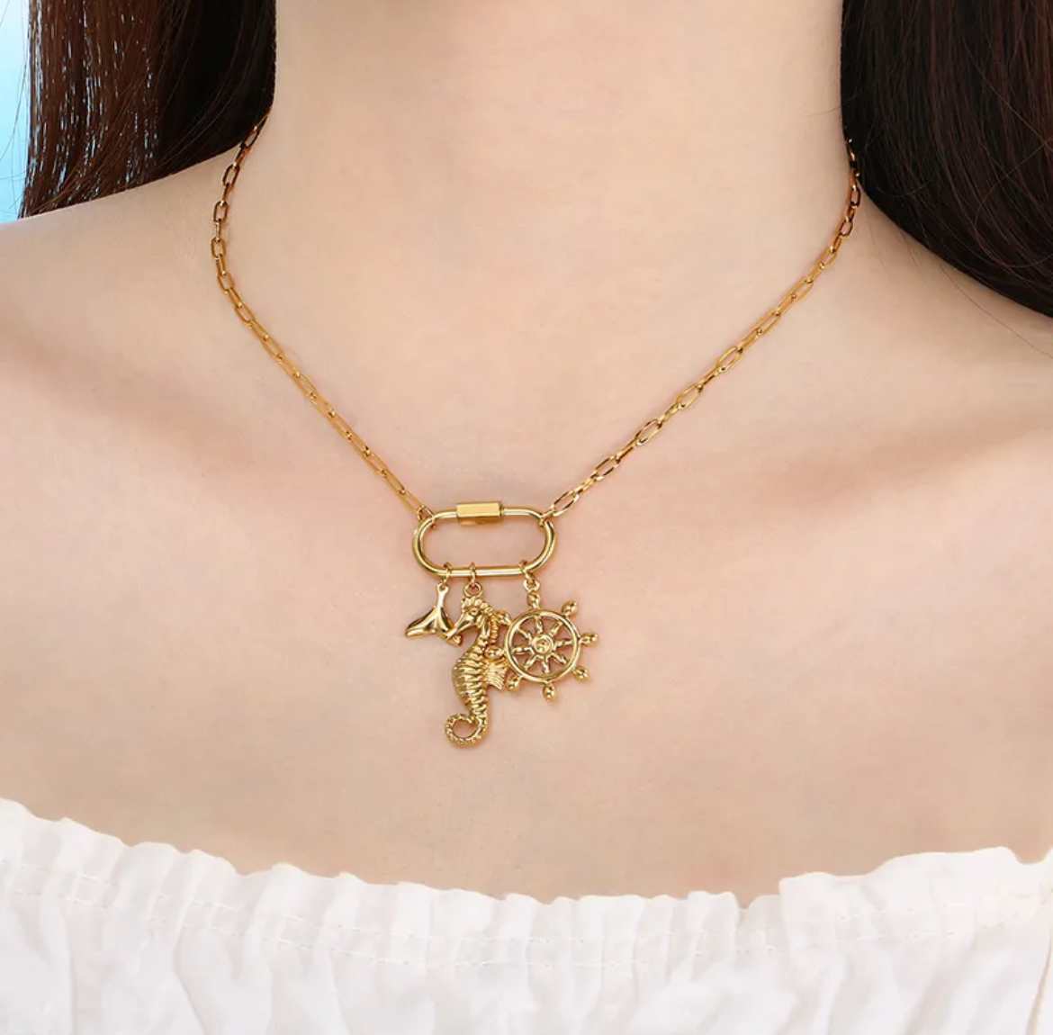 Design: Nautical charm necklace featuring a golden seahorse, wheel, and dolphin for a maritime touch