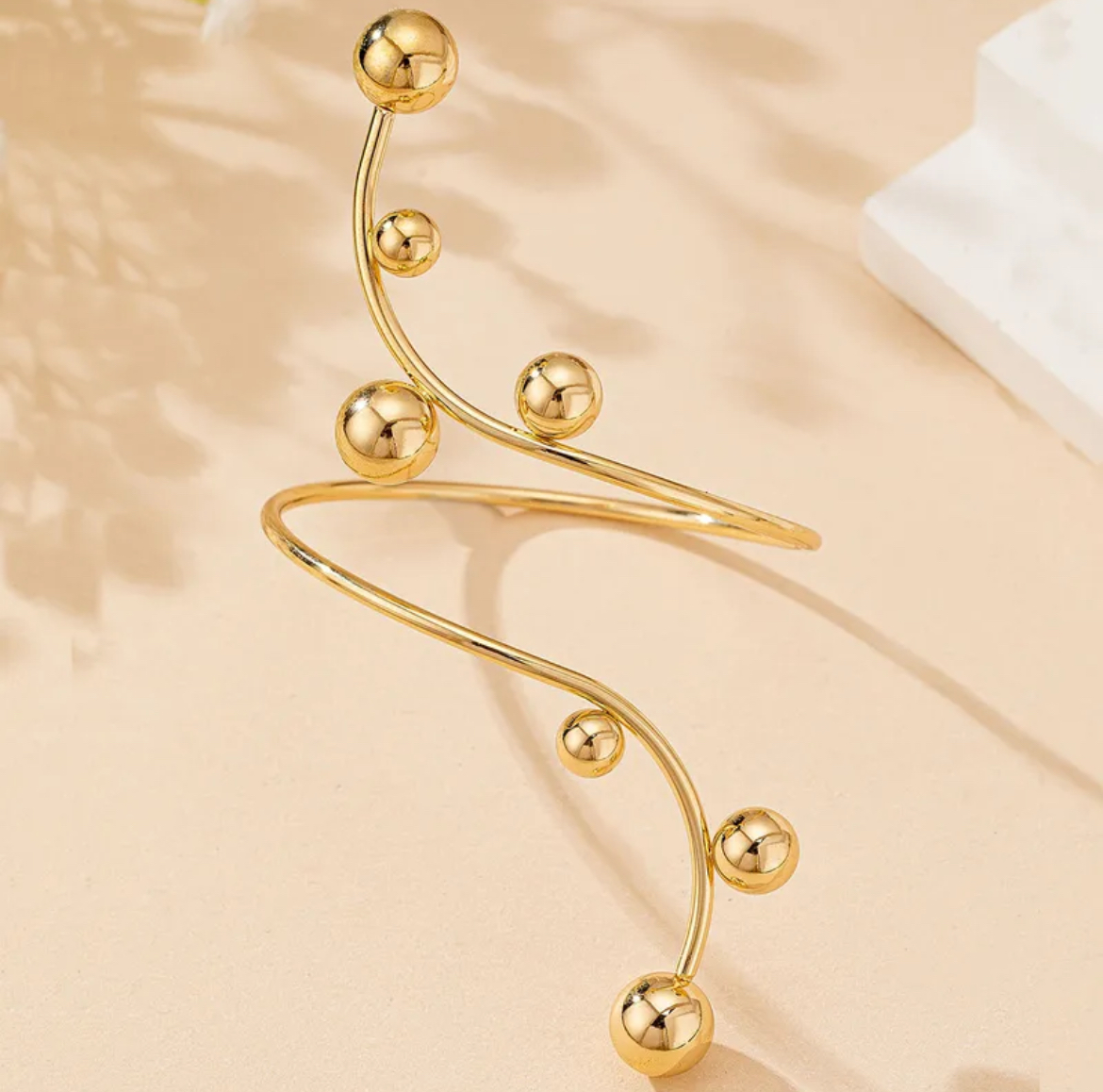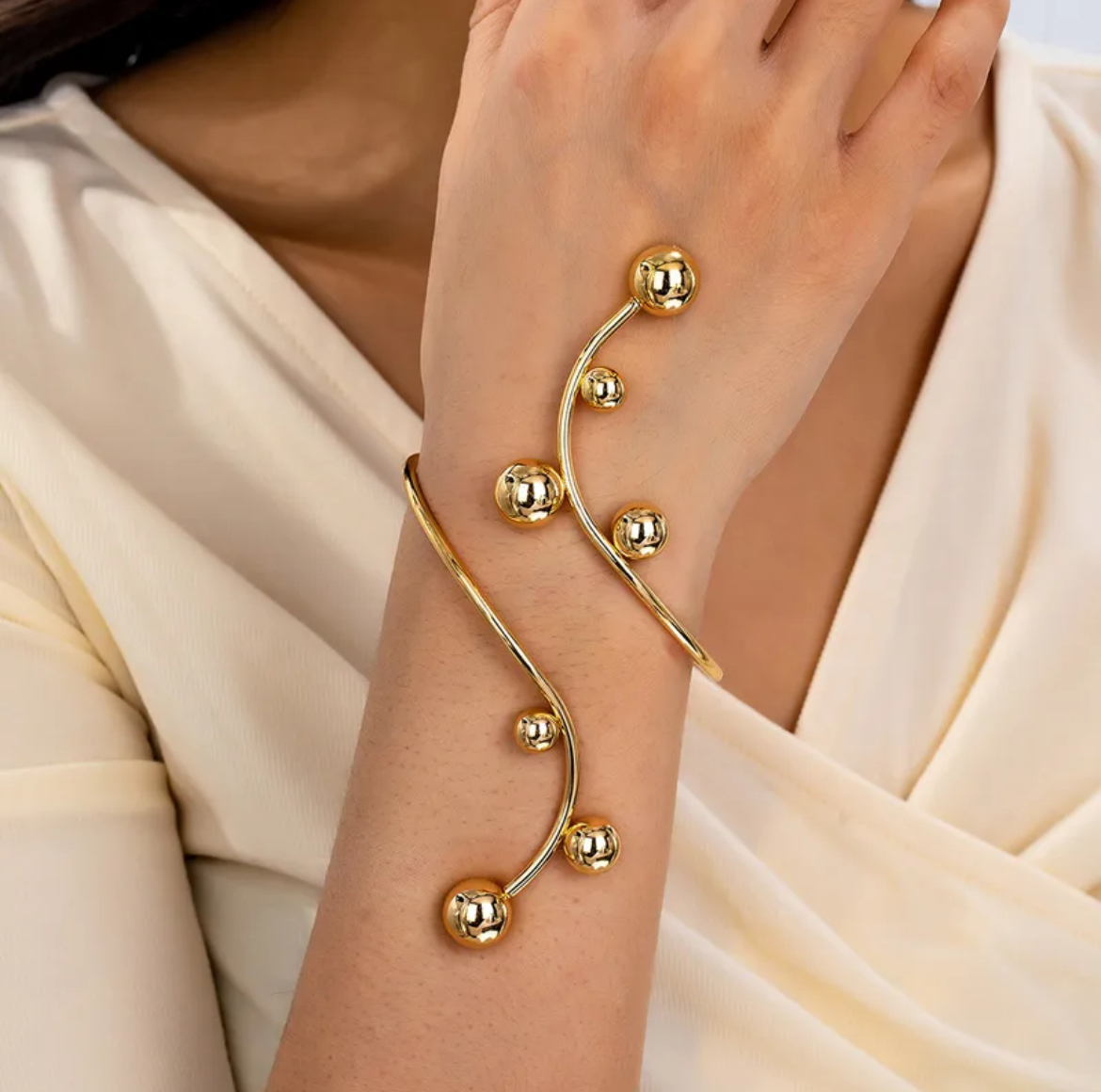 Design: Open cuff with a flowing arc, adorned with polished gold spheres