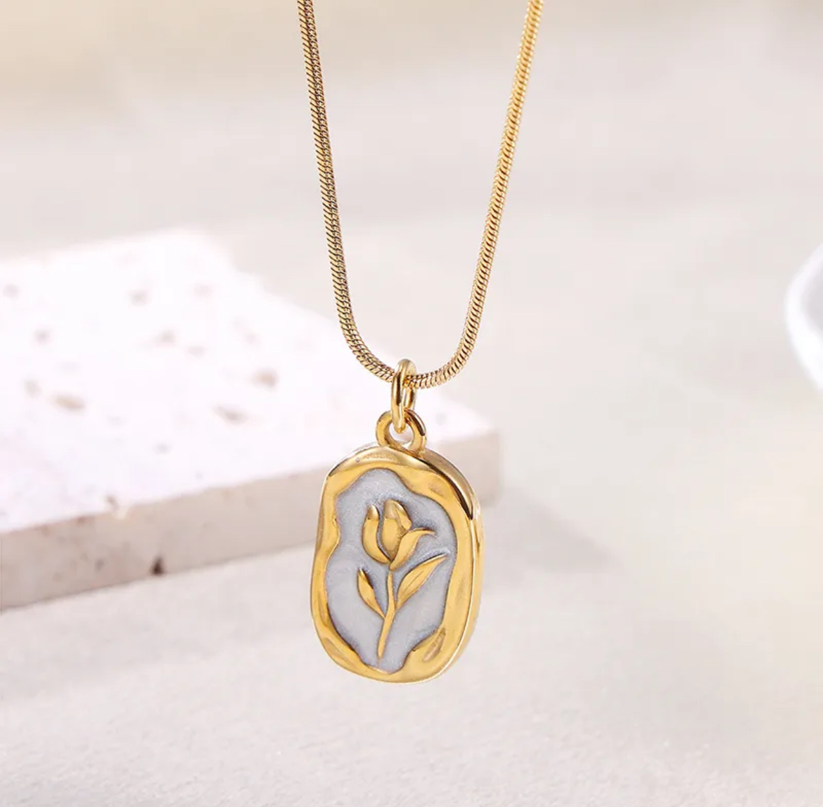 Design: Elegant oval pendant with a golden floral motif set against a soft pearl-white enamel base