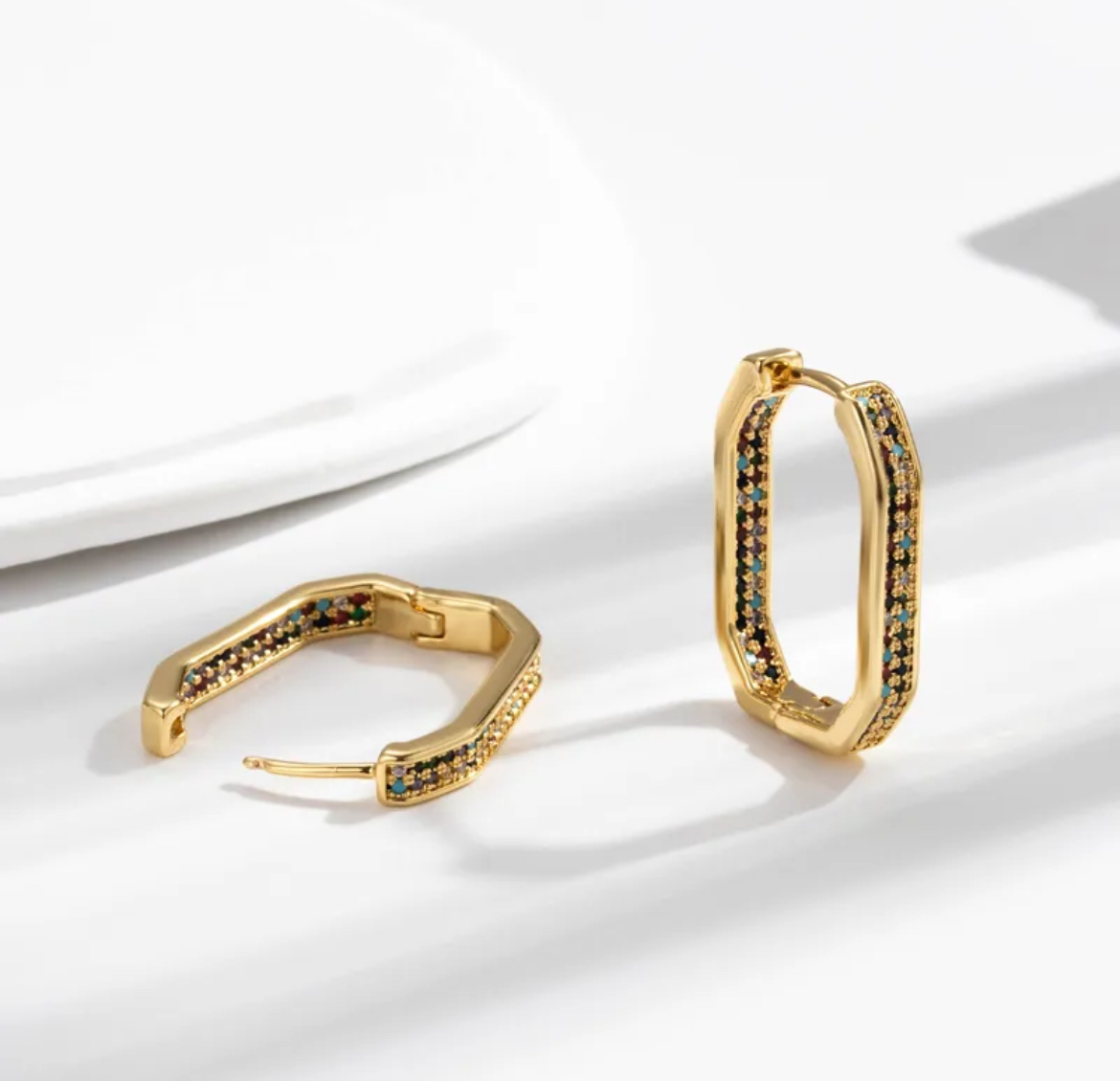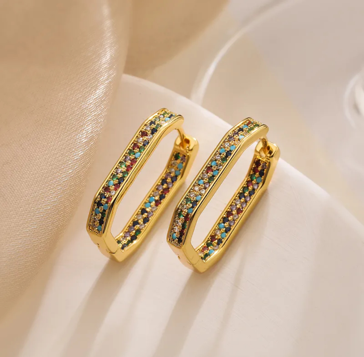 Design: Elongated, rectangular hoops adorned with a vibrant array of multi-colored, pave-set stones