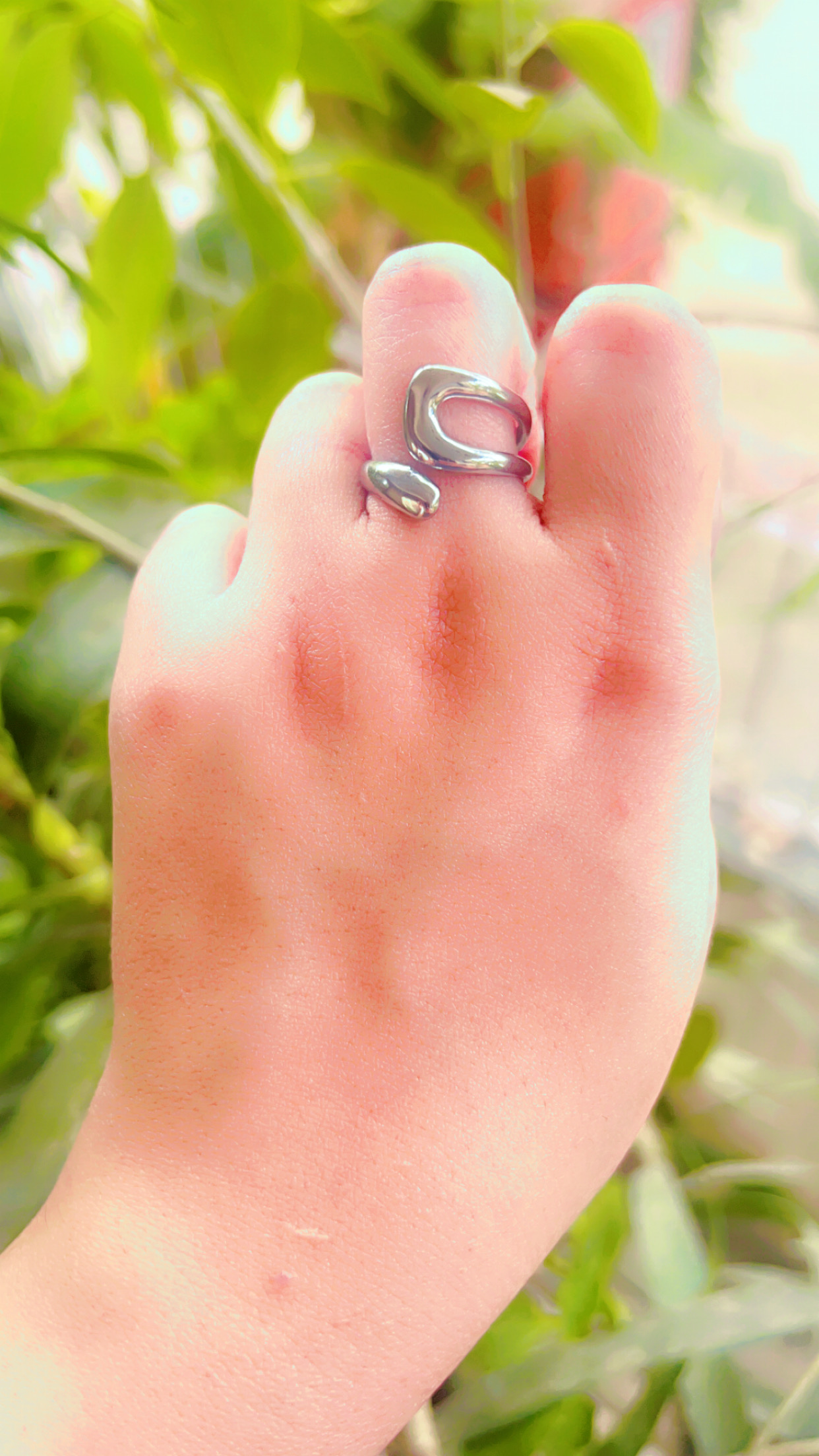 Design: A bold, open-ended ring with a unique fluid, sculptural design. It features two polished, droplet-like forms that gracefully wrap around the finger.