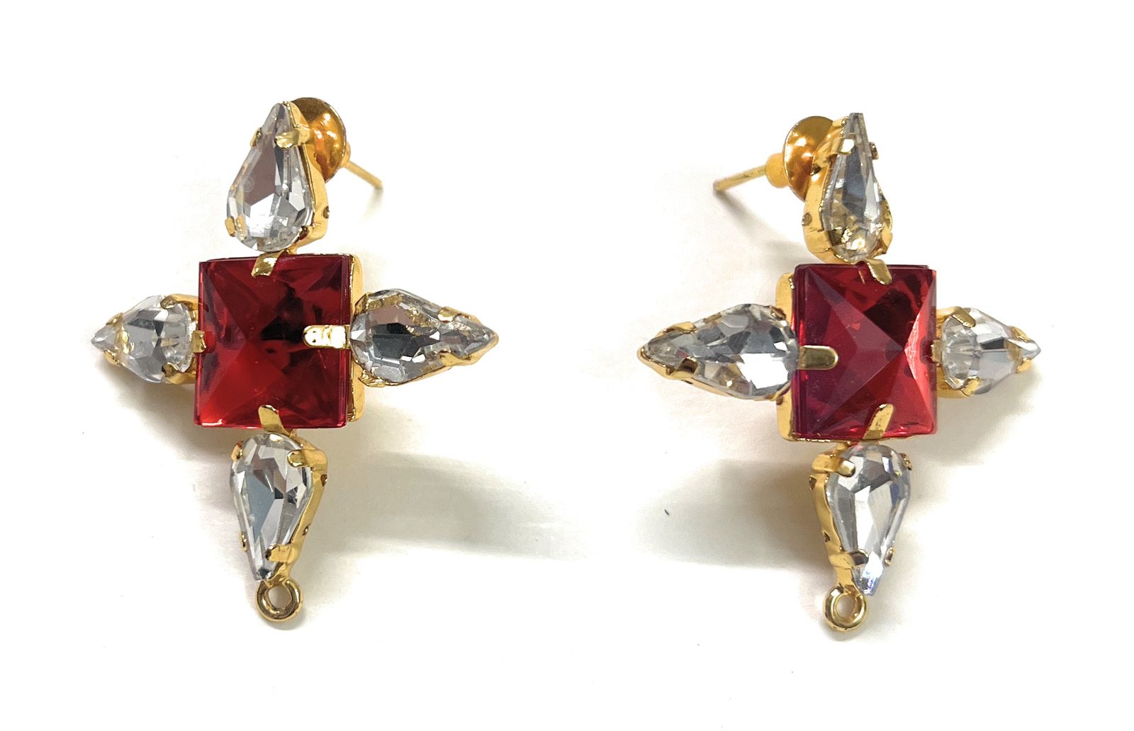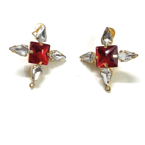 Design: Bold geometric stud earrings featuring a square-cut crimson stone surrounded by clear teardrop crystals in a cross pattern