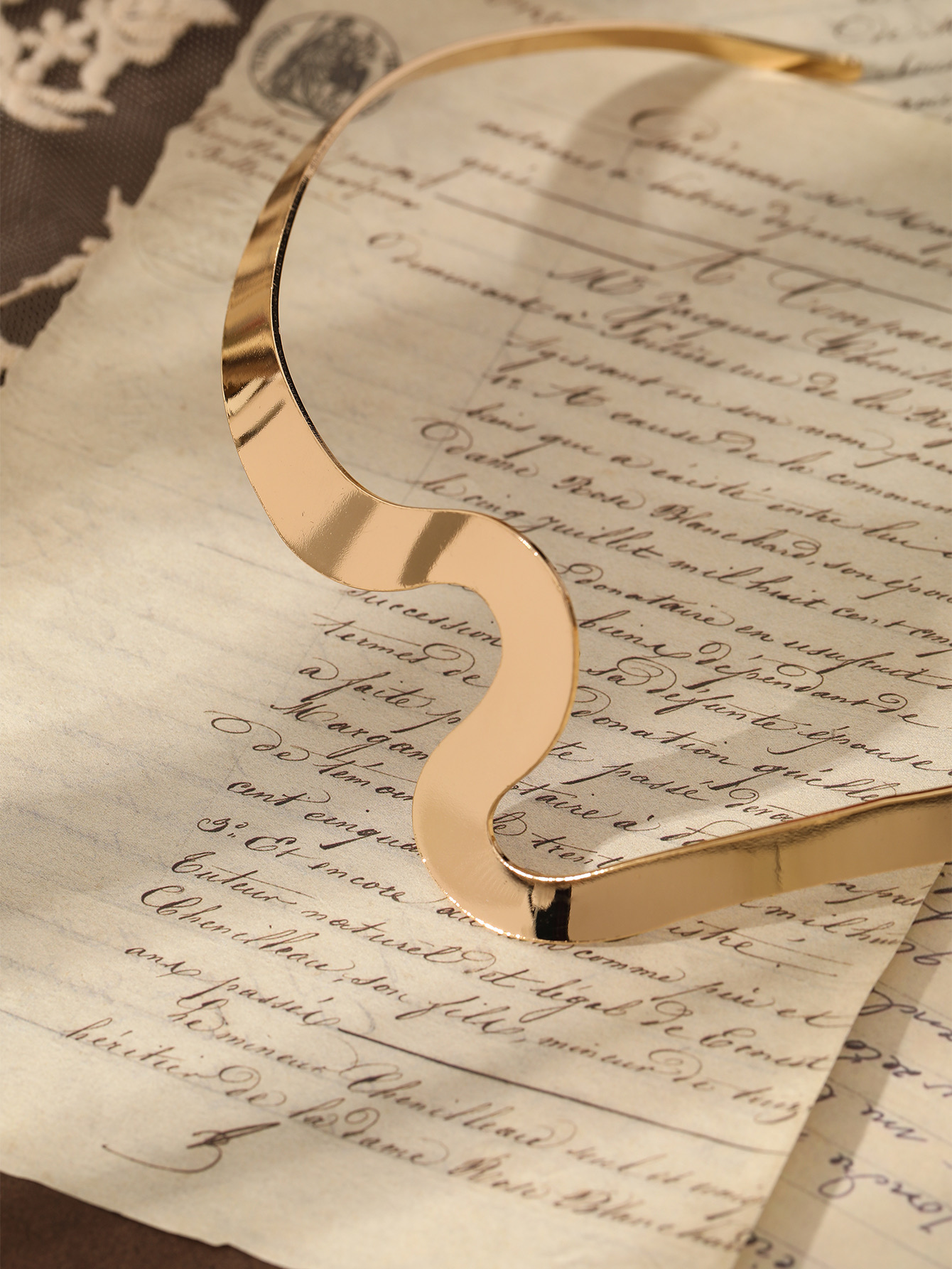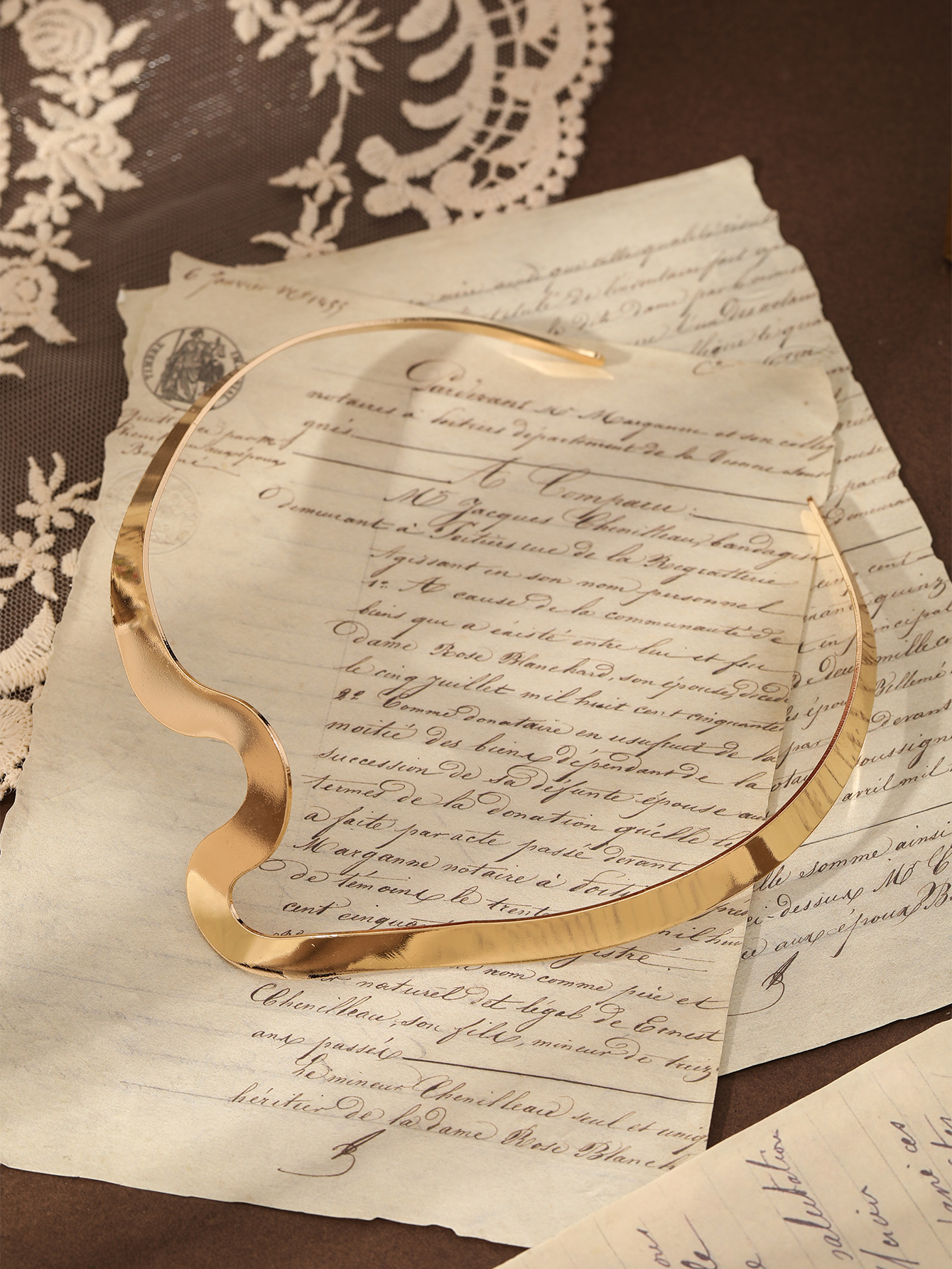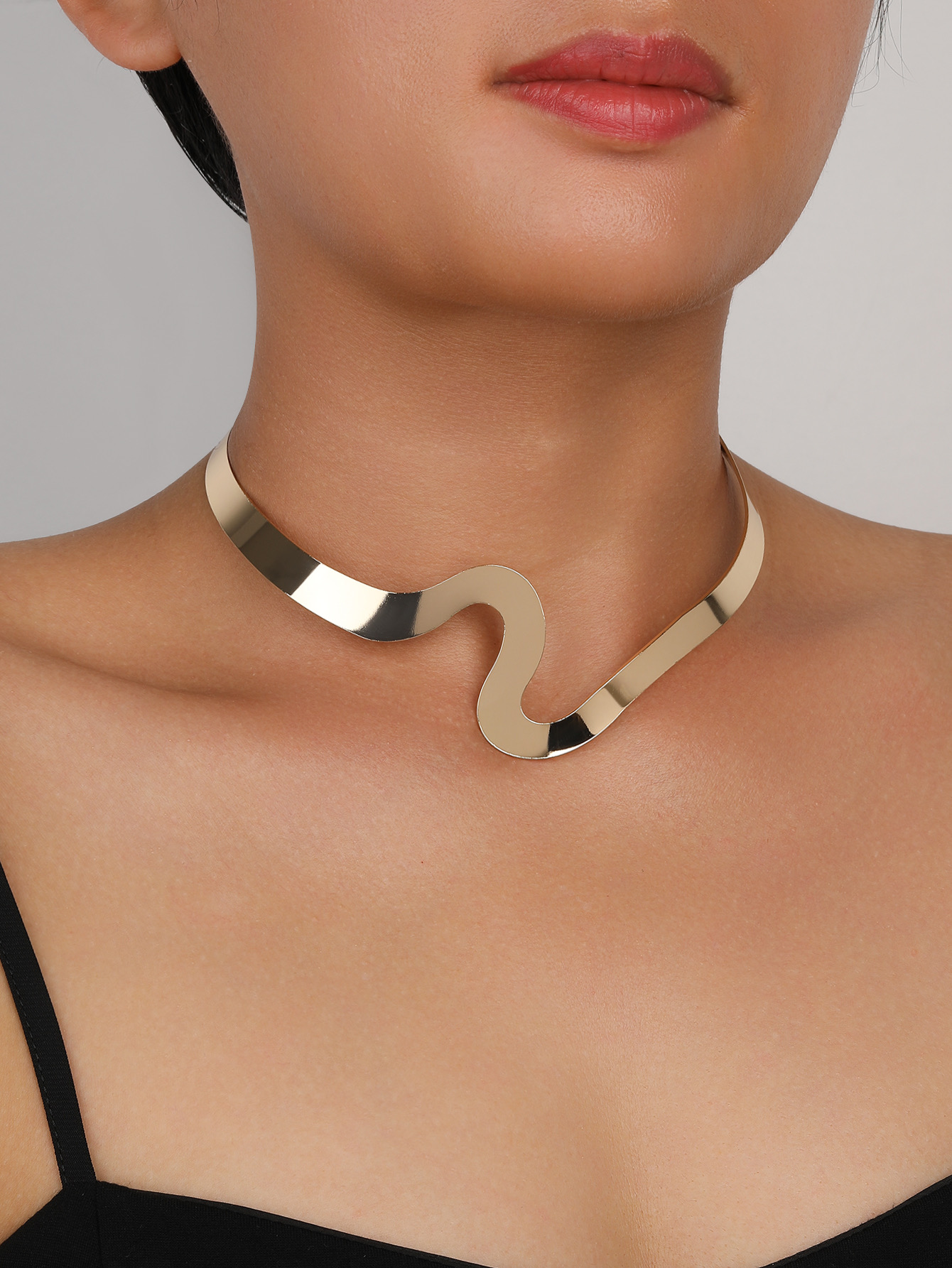 Design: A sleek, sculptural choker with a unique, fluid wave design. Its high-polish finish mimics the look of molten gold, gracefully hugging the neck for a modern and dramatic effect.