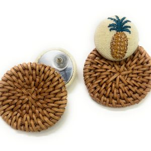 Design: Playful round earrings with embroidered pineapple tops and handwoven rattan discs