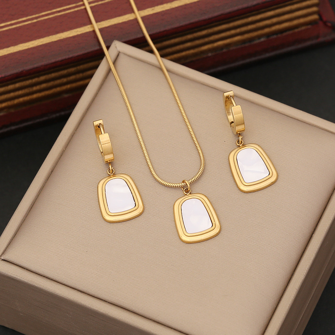 A timeless blend of modern minimalism and soft elegance, this white enamel pendant set features a sleek gold-tone frame paired with a subtle reflective finish. Designed to add effortless sophistication, it’s perfect for both everyday wear and special occasions.