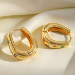• Design: Wide, rounded huggie-style hoops with flush-set multi-colored stones.