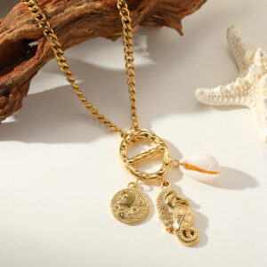 This piece features a classic curb chain holding a textured, circular ring clasp that artfully displays a trio of sea-inspired treasures: a polished golden seahorse, a white cowrie shell, and a coin-style medallion embossed with a delicate seashell. This necklace serves as a perfect vacation accessory or a daily reminder of sunny days by the shore.